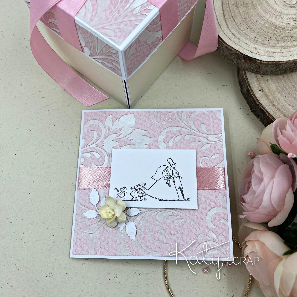 elegantní přání doplněné tiskem svatebního páru a saténovou stuhou