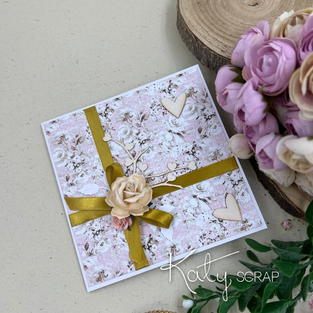 elegantní přání doplněné saténovou stuhou a výřezy se srdíčky